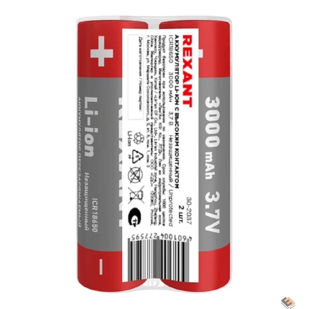 Rexant (30-2037) Аккумулятор Li-ion (литий-ион) 18650, 3,7В, 3000мАч, без платы защиты, 2 шт, пластиковая упаковка