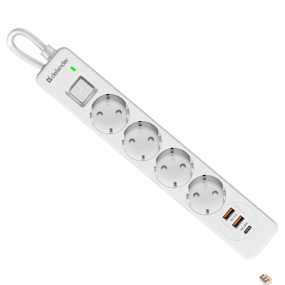 Defender Удлинитель с сетевым фильтром DFS 145 5 м,белый,4розетки,USB+TypeC [99435]